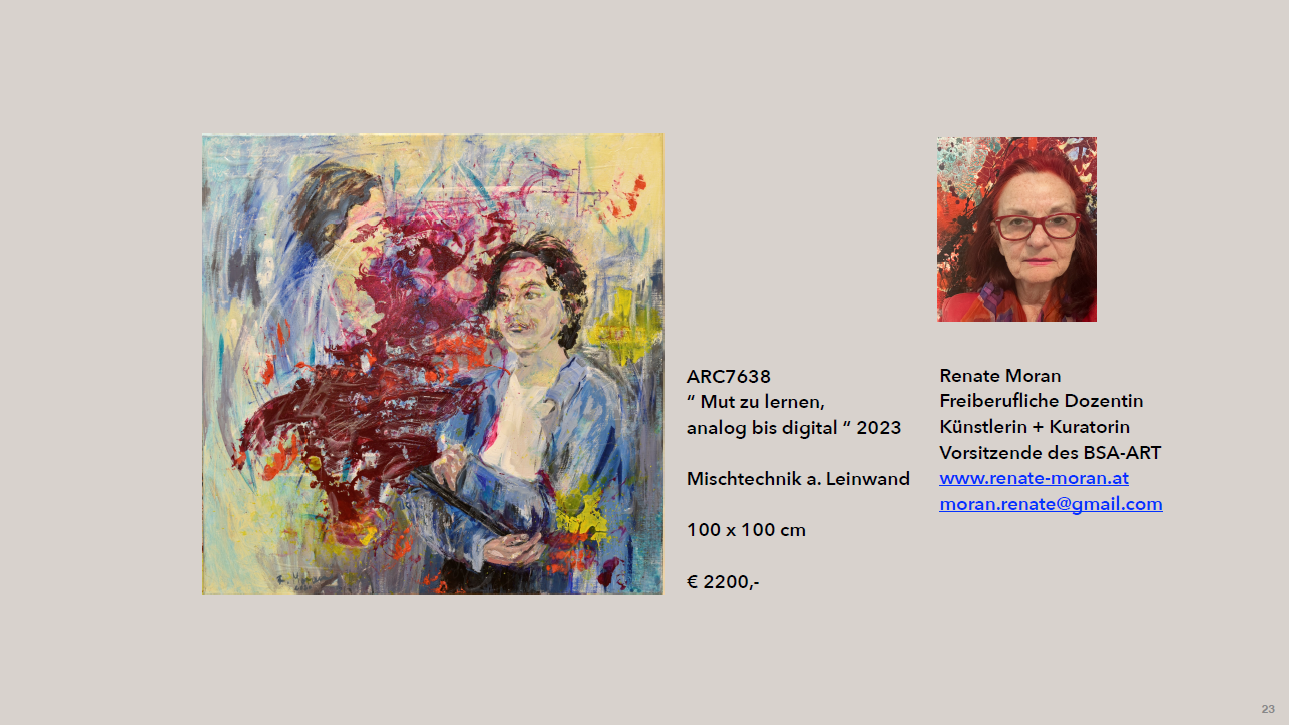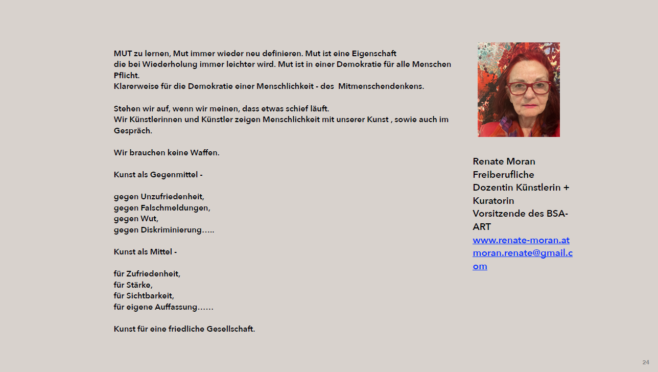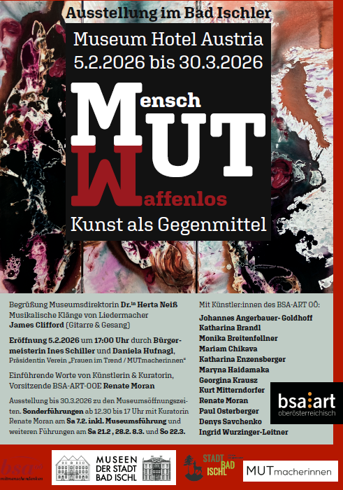 Die von unserem Mitglied Renate Moran kuratierte Kunstausstellung beschäftigt sich mit dem Thema Mut in allen seinen Fassetten. Dabei wird das Thema "Mut, Mensch, waffenlos " bezugnehmend auf die Lage der Welt von Künstler*innen im BSA-ART- OOE gesehen und bearbeitet. Unterschiedlichste Zugänge formen diese Kunstausstellung zu einer Plattform des künstlerisch, politisch sichtbaren Erlebens und Denkens.